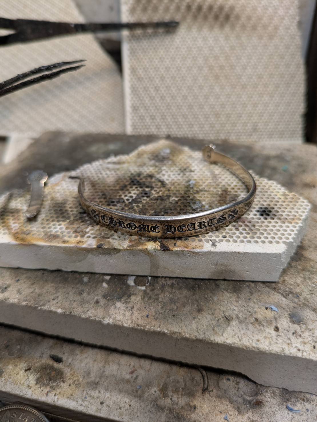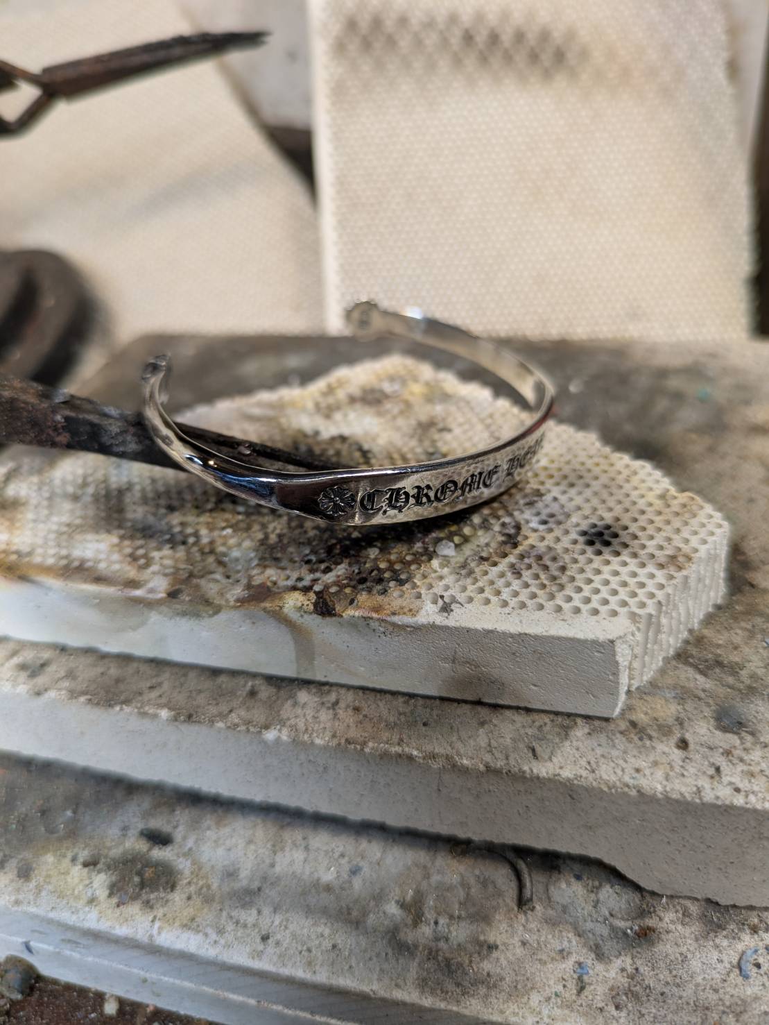 過去にウチで異なるクロムハーツのバングルをS字フック化したお客様から何年かぶりのご連絡でバングルの修理の問い合わせが先日入りまして、「現物確認で可否を決める」という事でご来店。
