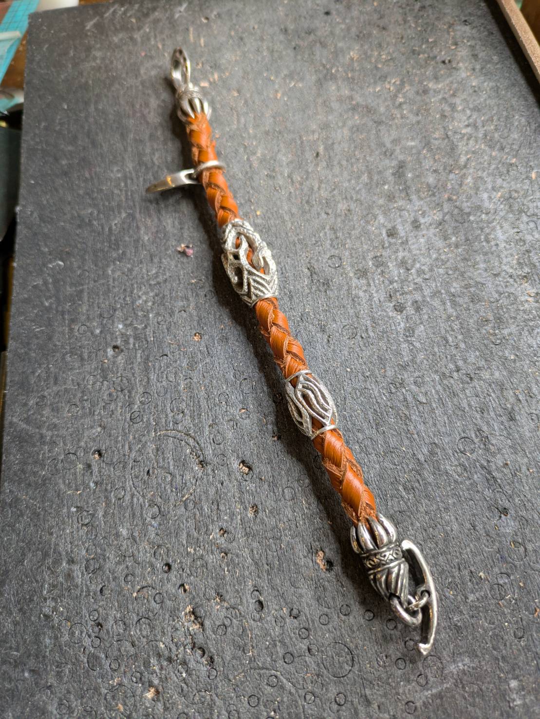 4つ編みで編み上げてブレスレット紐を作り上げ、シルバーの配置を決めていく。