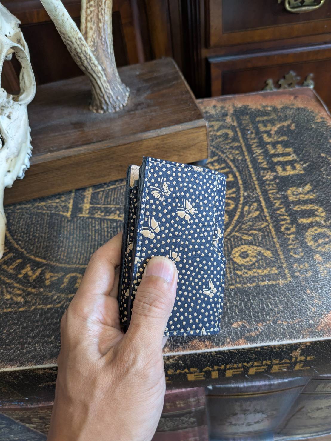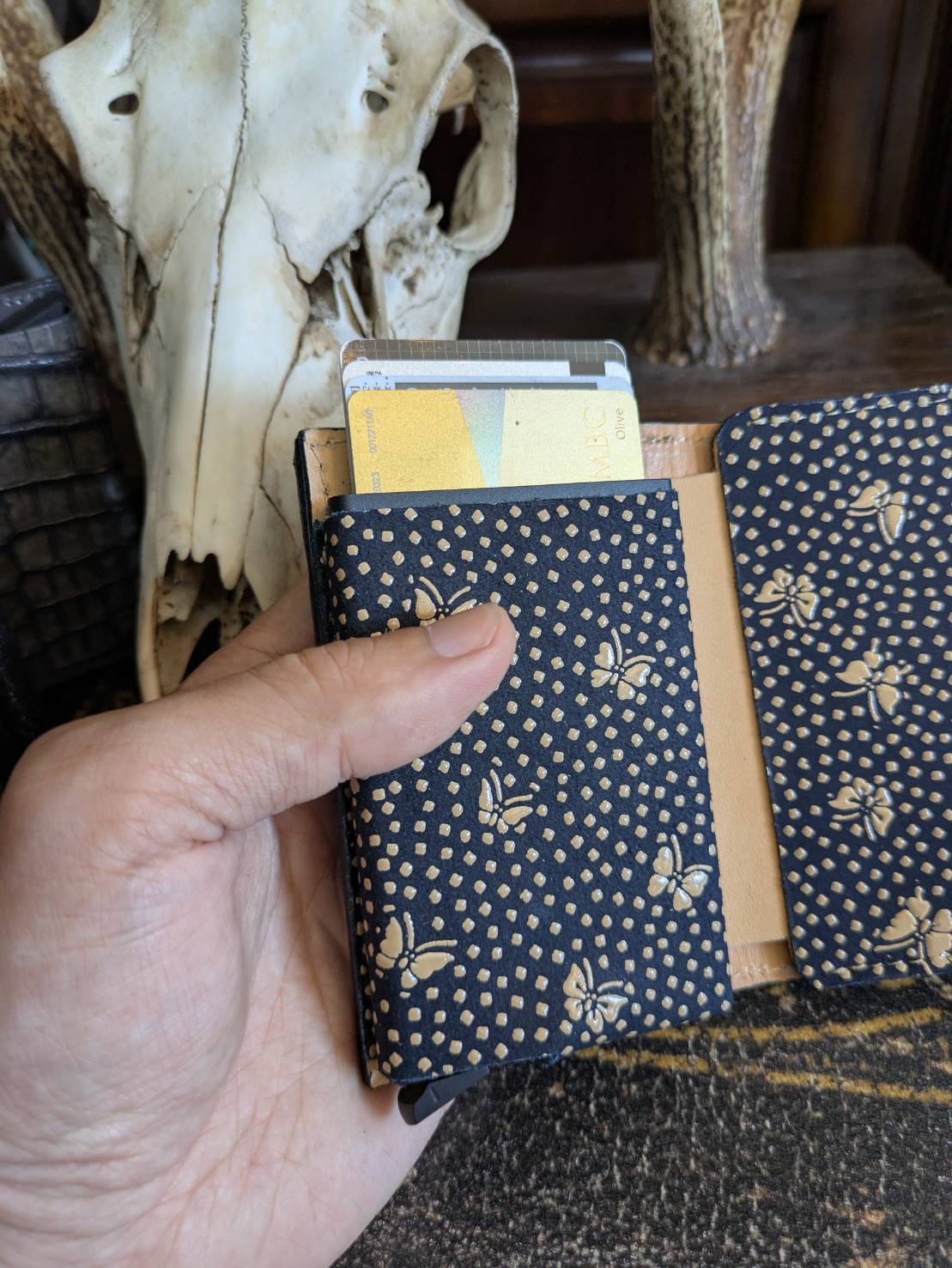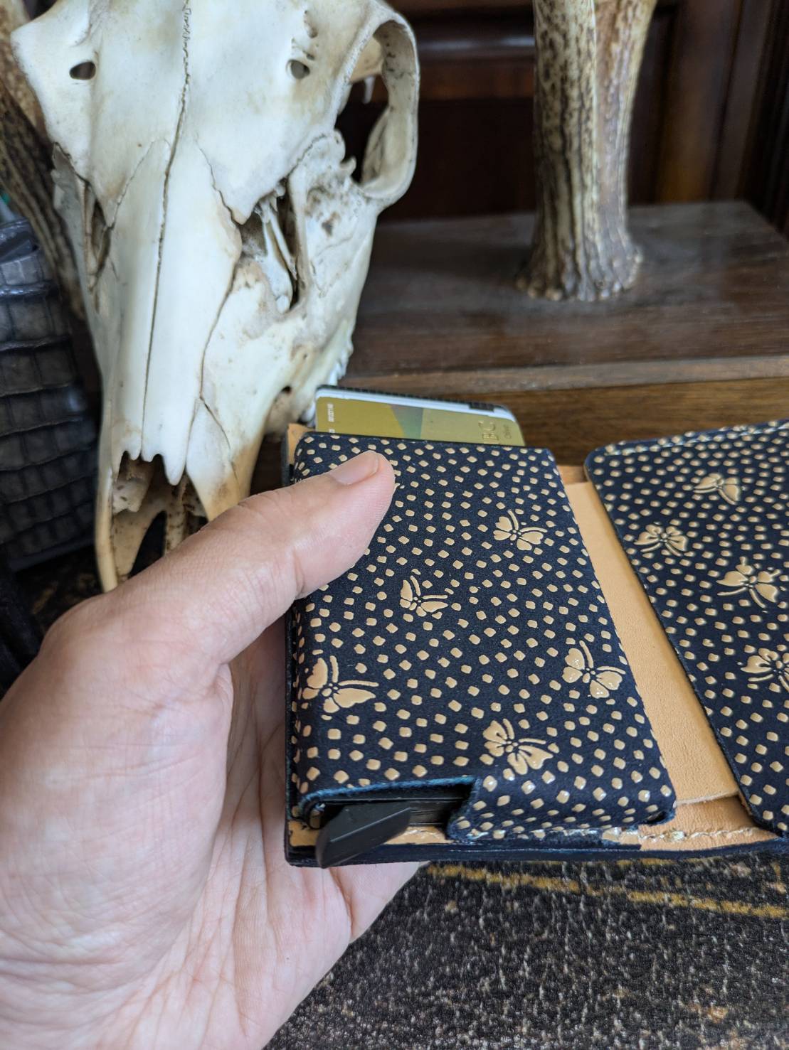 限定登場!スライドカードケースのベースモデルの印伝限定蝶々と墨染めクロコダイル!