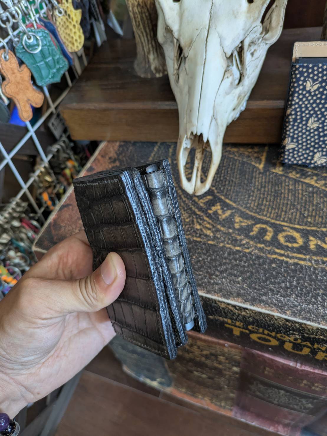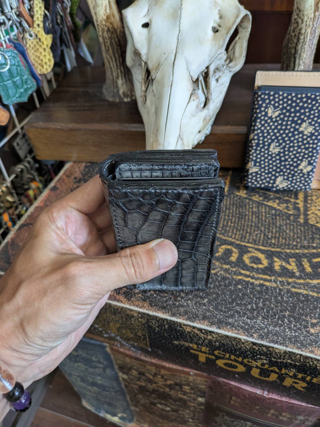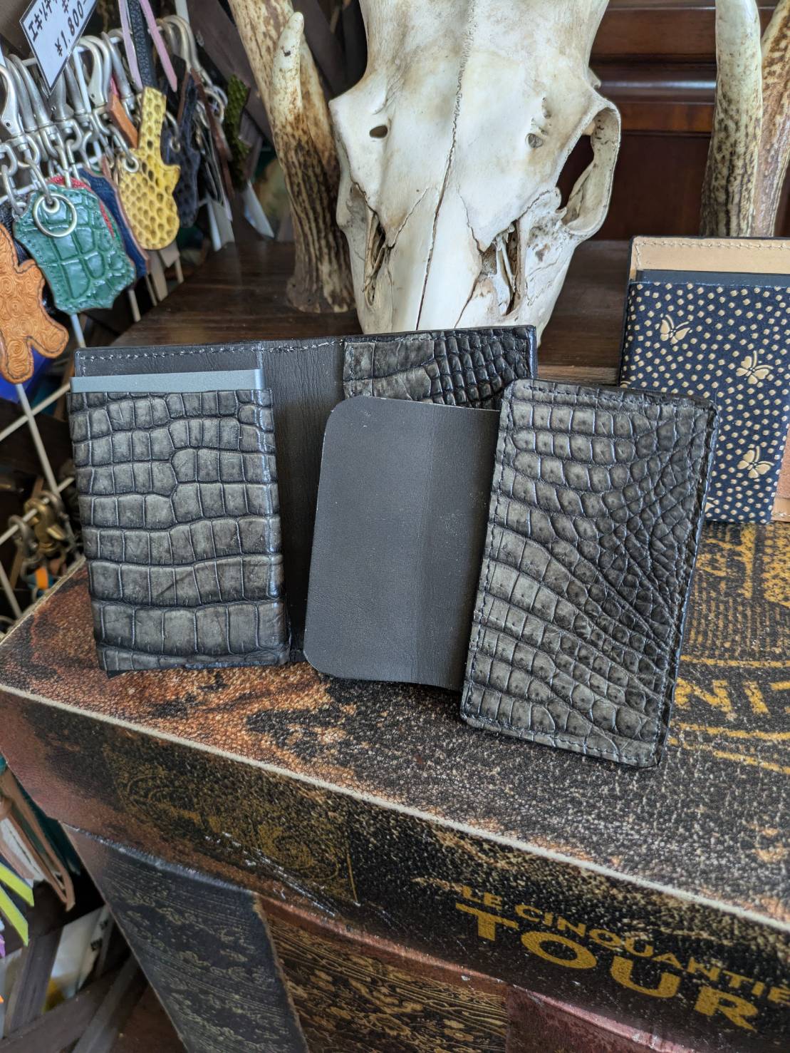 印伝と墨染めクロコダイルの二点限りです。