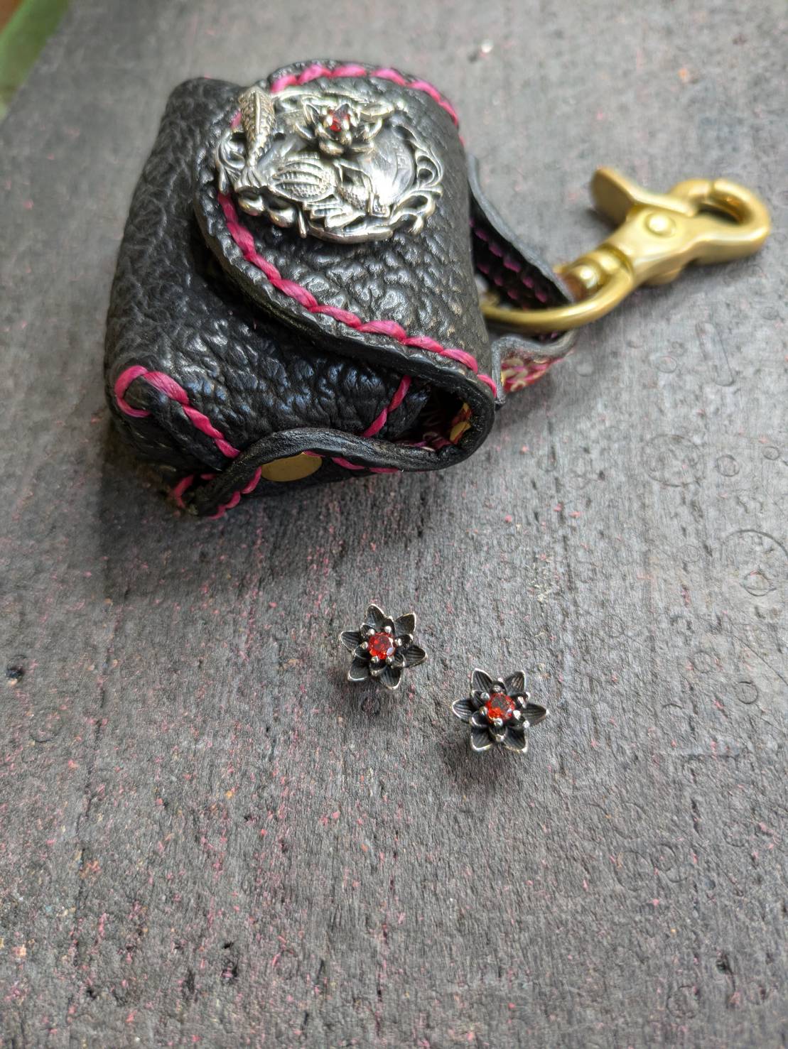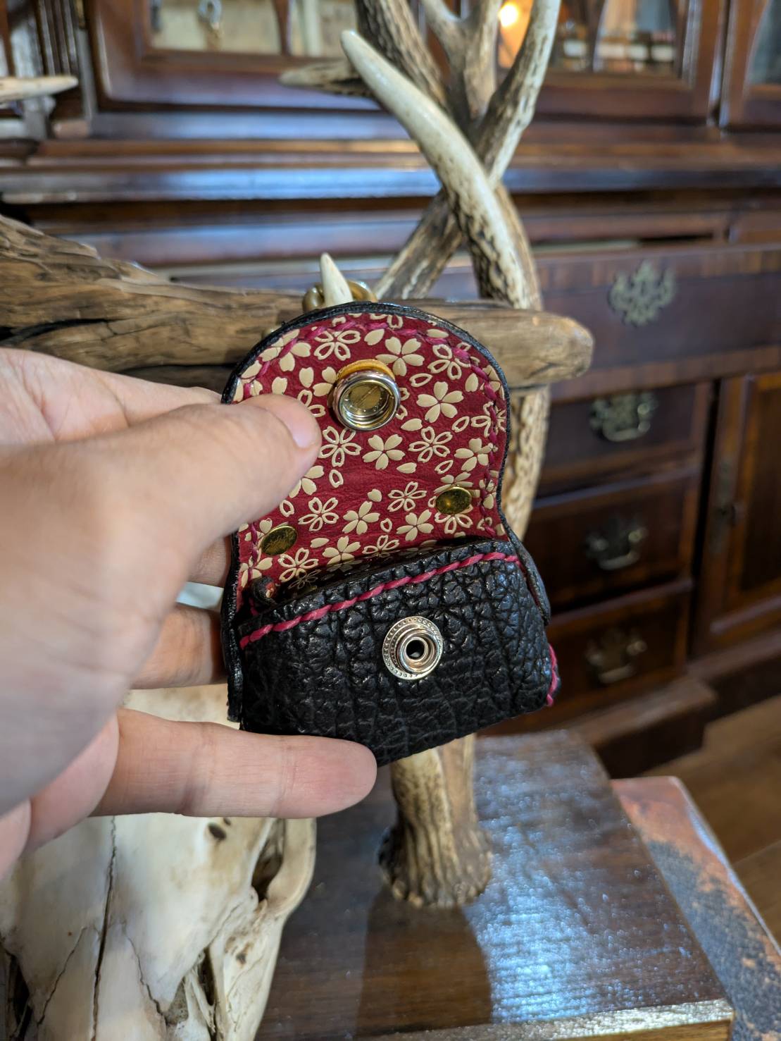 サメ革を銀面に置き、蓋を開くと印伝の桜吹雪が顔を出す凄まじいBluetoothイヤホンのケースです♪
