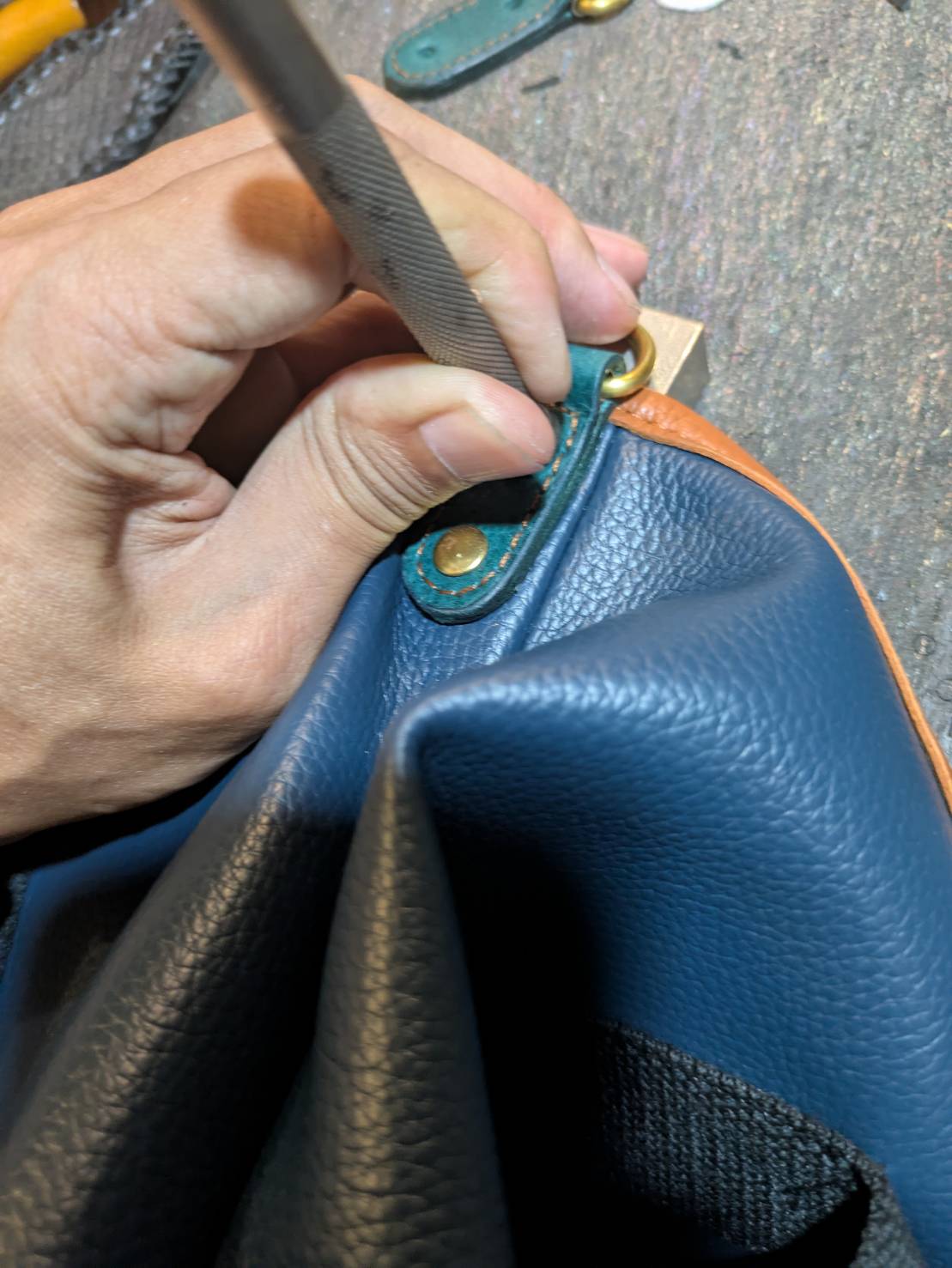 バッグに対して凄まじい根革とBRASS金具が装着していくという工程ww