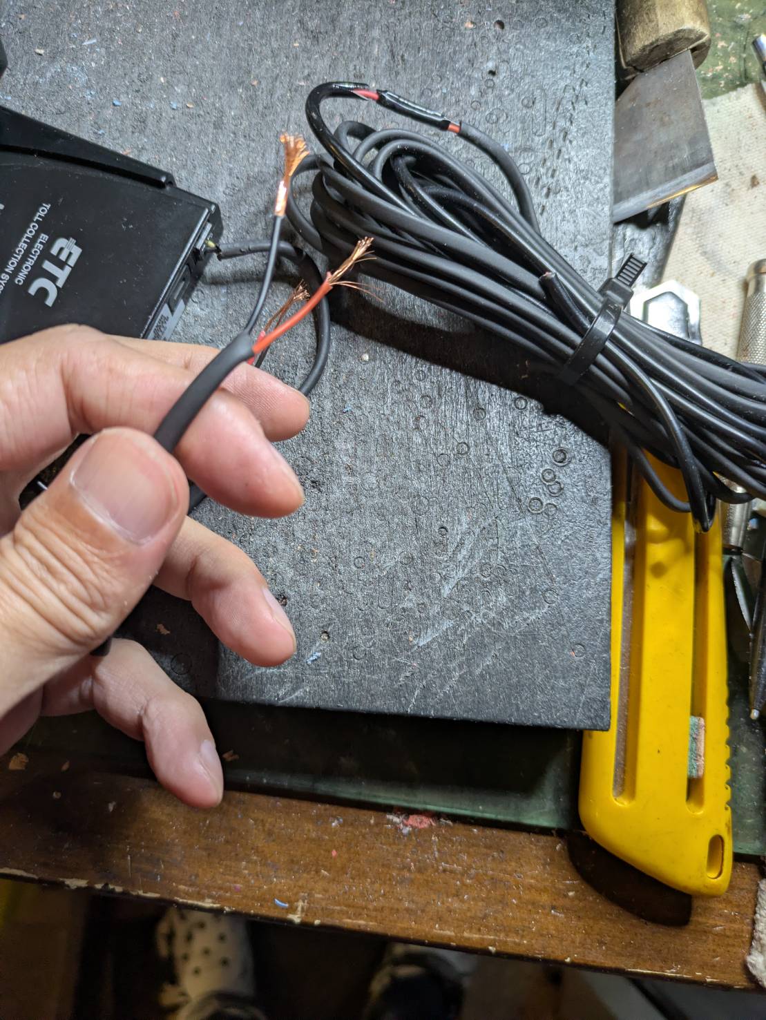 まぁ日常茶飯事と言えば日常茶飯事だし革の依頼も頂いたのでついでの作業なのですが、配線を切断してただ短くするだけだろと思っていたら電気の変換機?なのかなんなのかわかりませんがETCとは異なる配線も切断するというねww