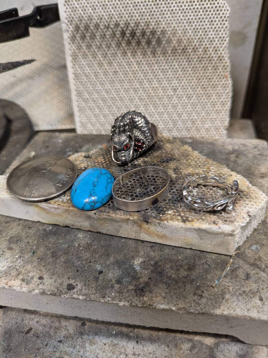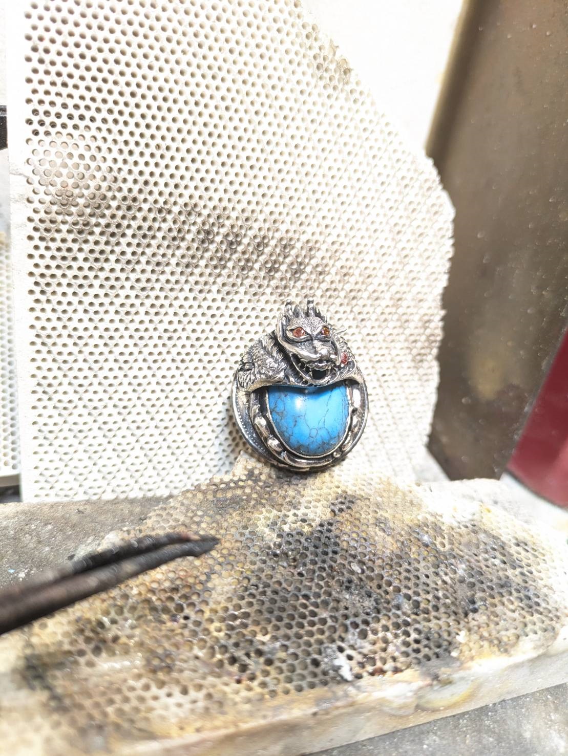 ドラゴンのリングのアーチを微調整しないとターコイズが収まらないんですよ。