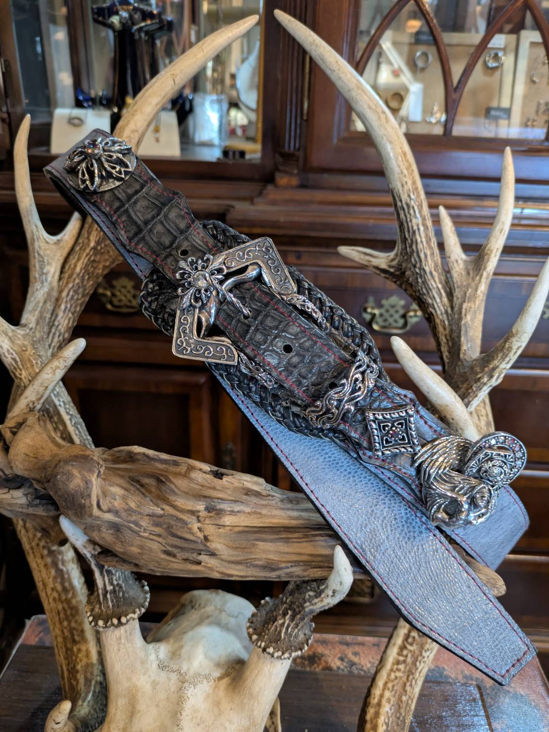 石を外してコンチョ化させて墨染めクロコダイルのレンジャーパーツを組み込んでオリジナルバックルにオリジナルサルカン、オリジナル剣先を盛り込んだ究極モデルに仕上げました。