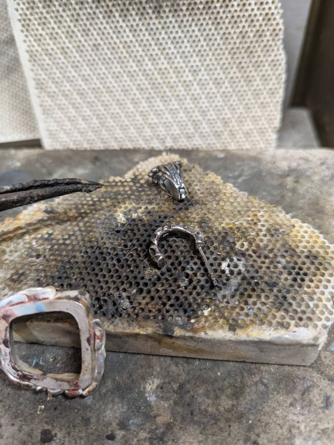 その石のサイズに合わせて組み上げ、少しクリアランスを残してシルバーピアスとバチカンを選定してこの印台に組み込んでいきます。