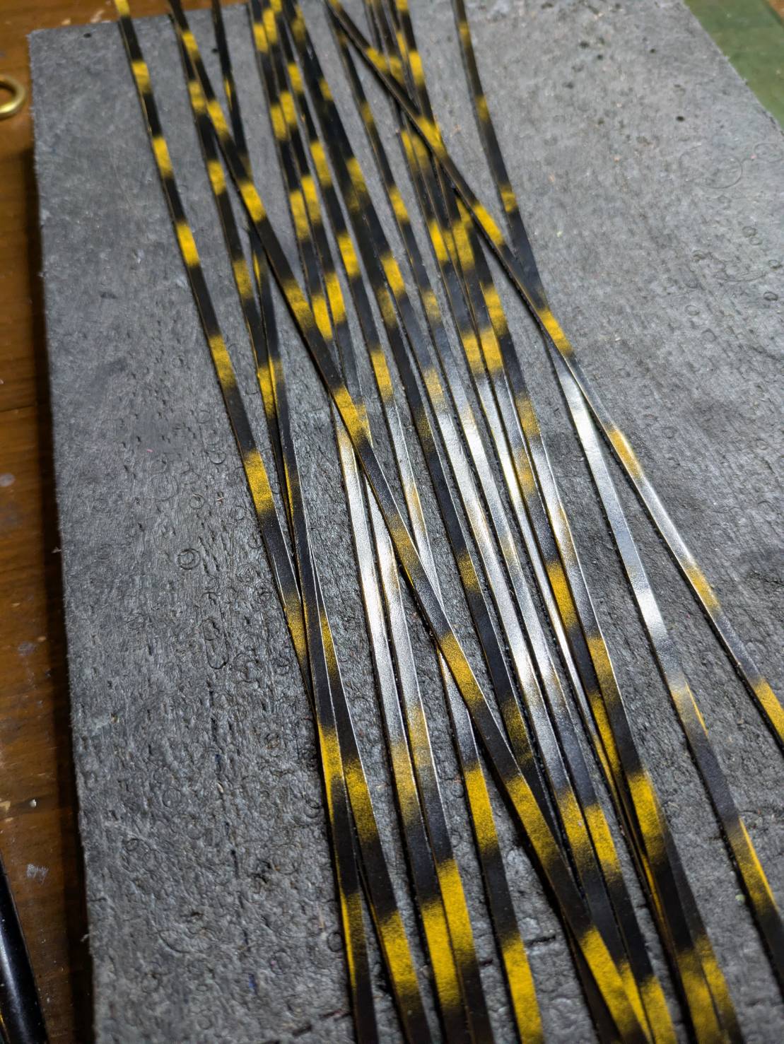 全て手切りで3mmに革包丁で割き、色も部分研磨して黄色を出し、少しずつトリプルステッチを入れていくという苦行を施工しましたよ。。。笑