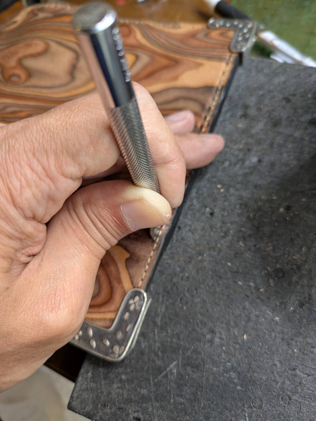 この時は最初トリプルステッチの依頼のご来店だったんですが、「ちょ、ちょっと待ってください!」的な展開になり、トリプルステッチを延期してこの角パーツを優先するというww