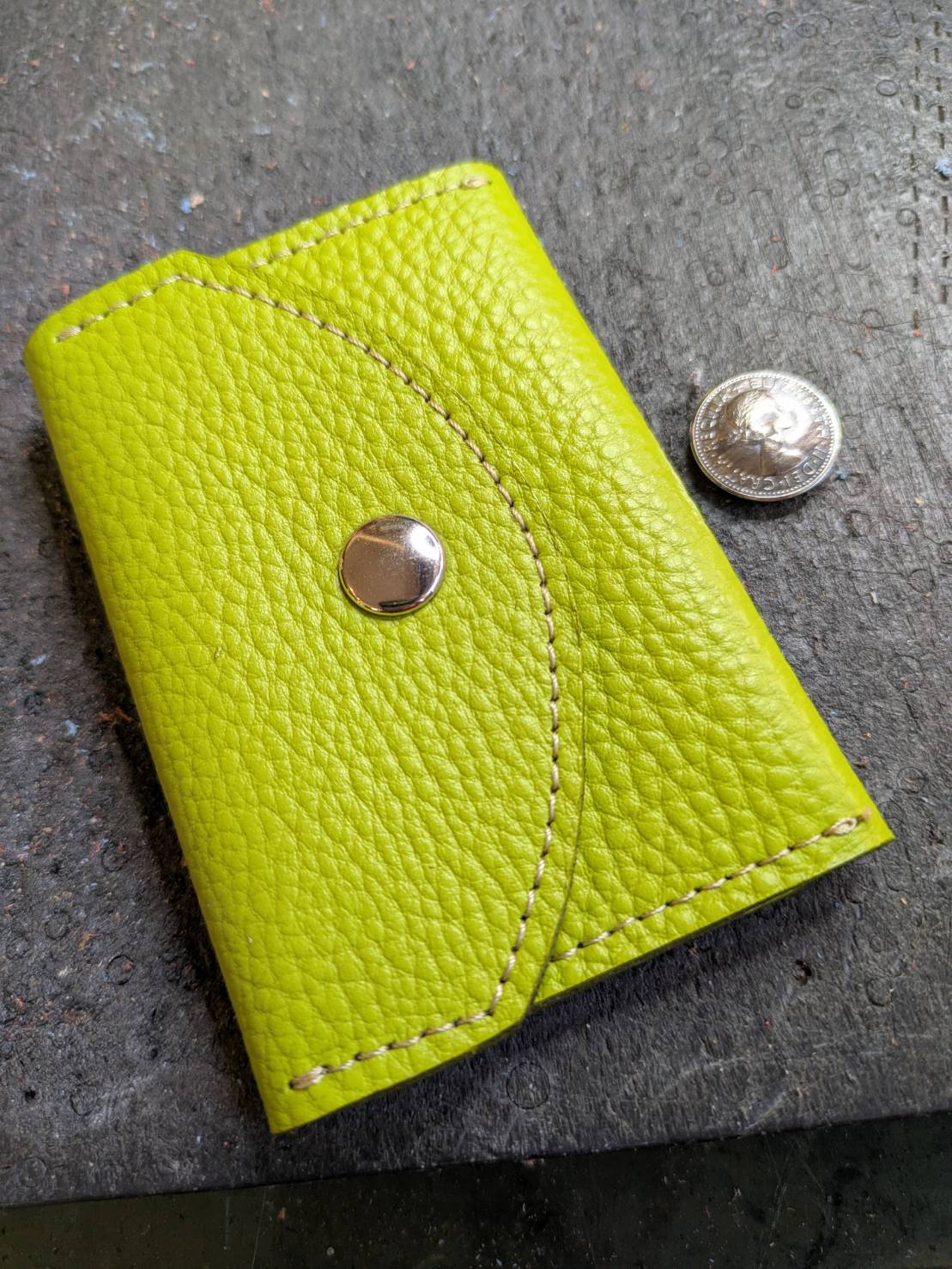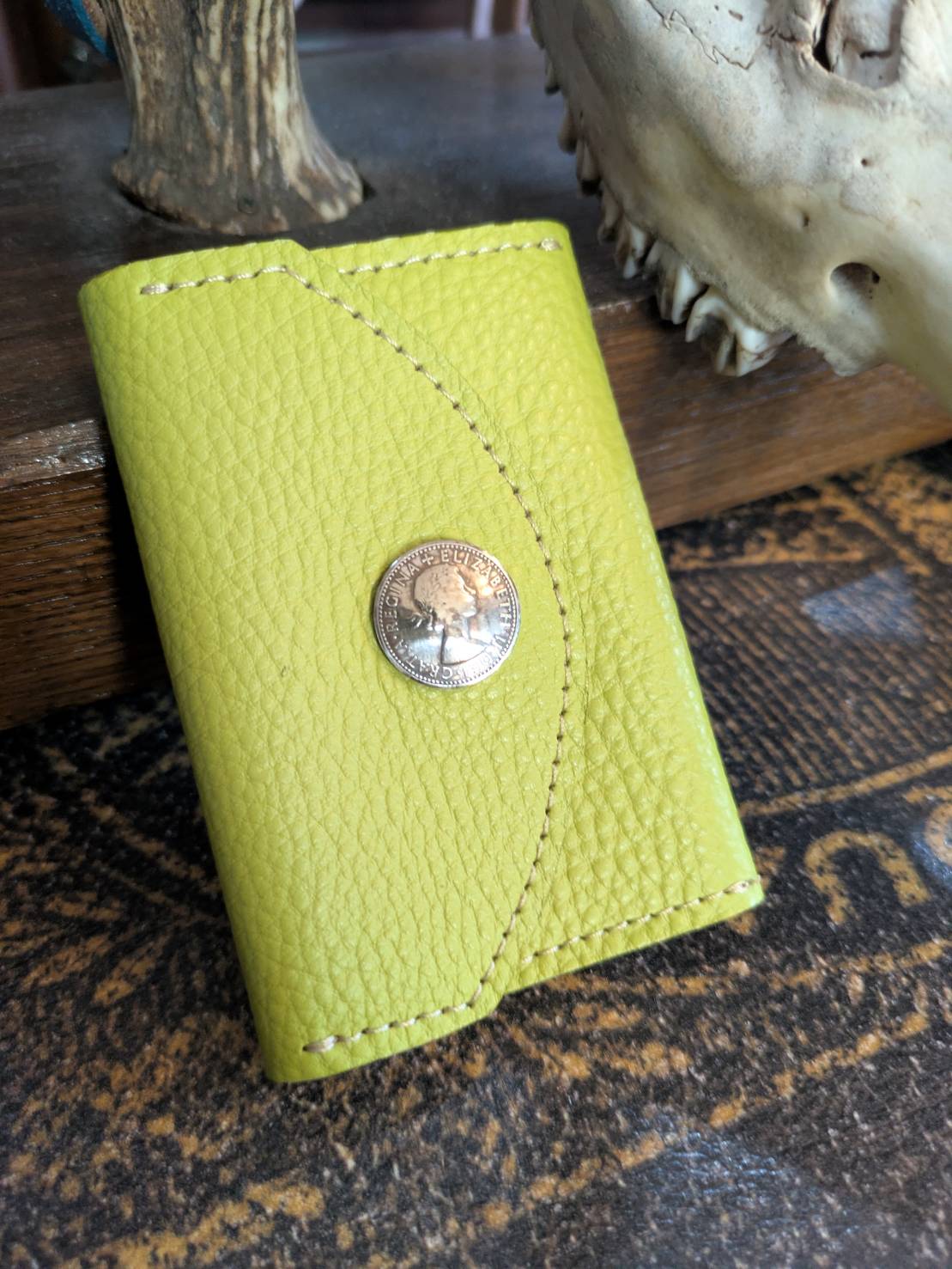 めっちゃおしゃれじゃないですか。半世紀以上昔のコインを革小物のボタンになっている唯一無二になっているんです。