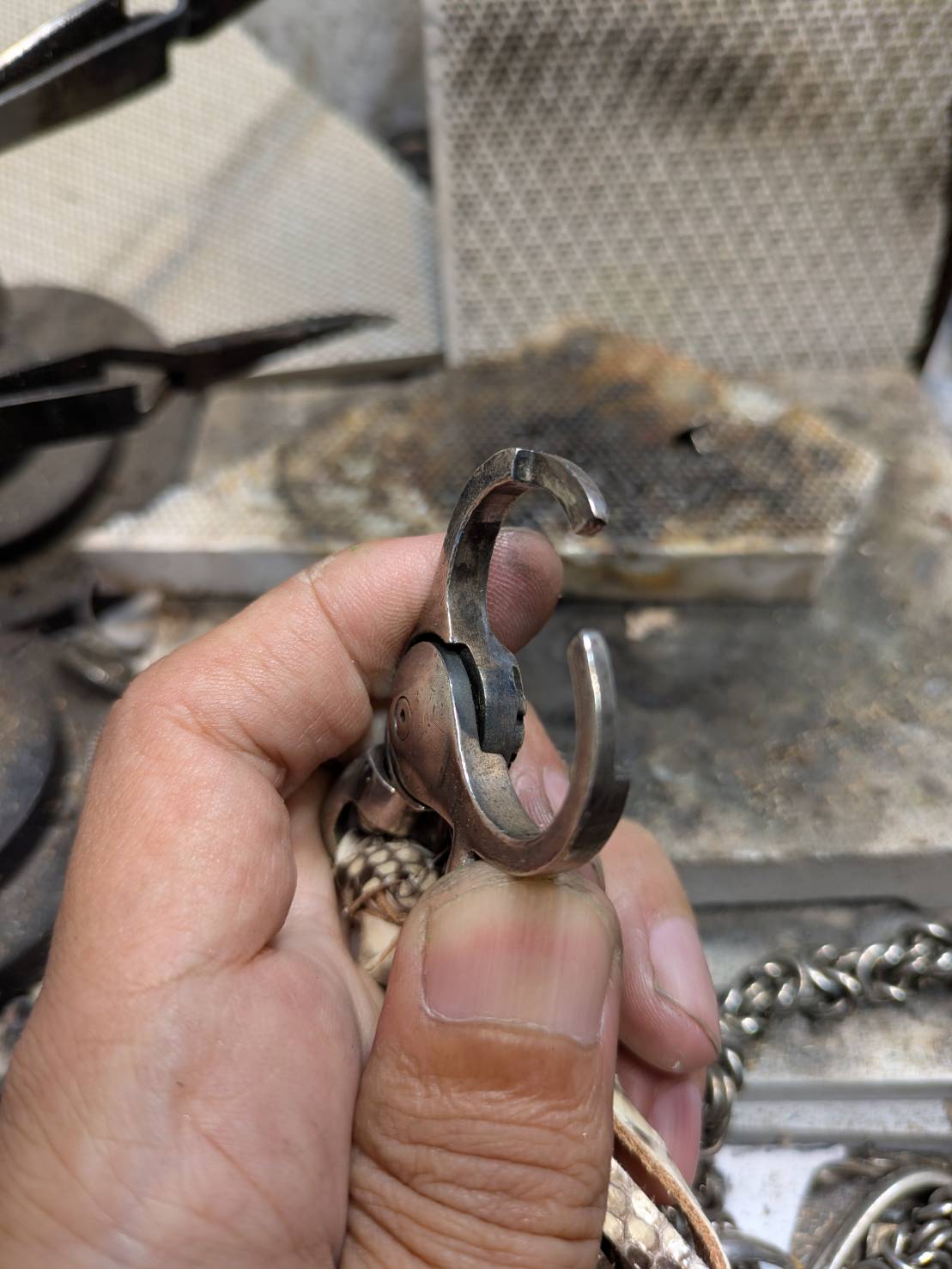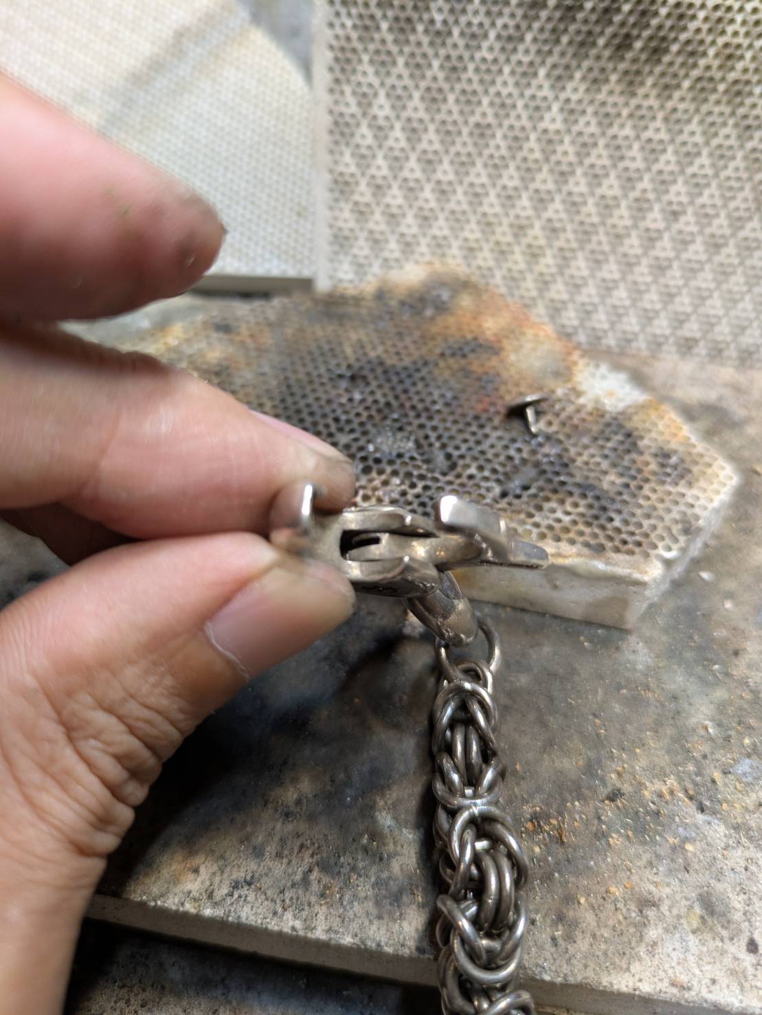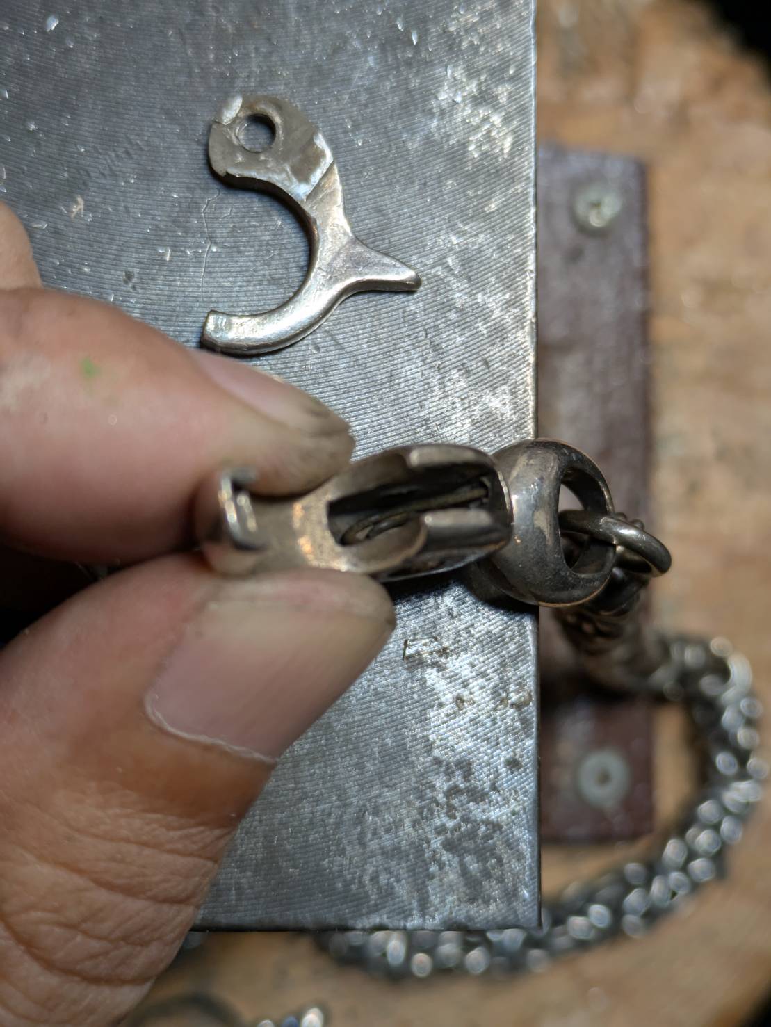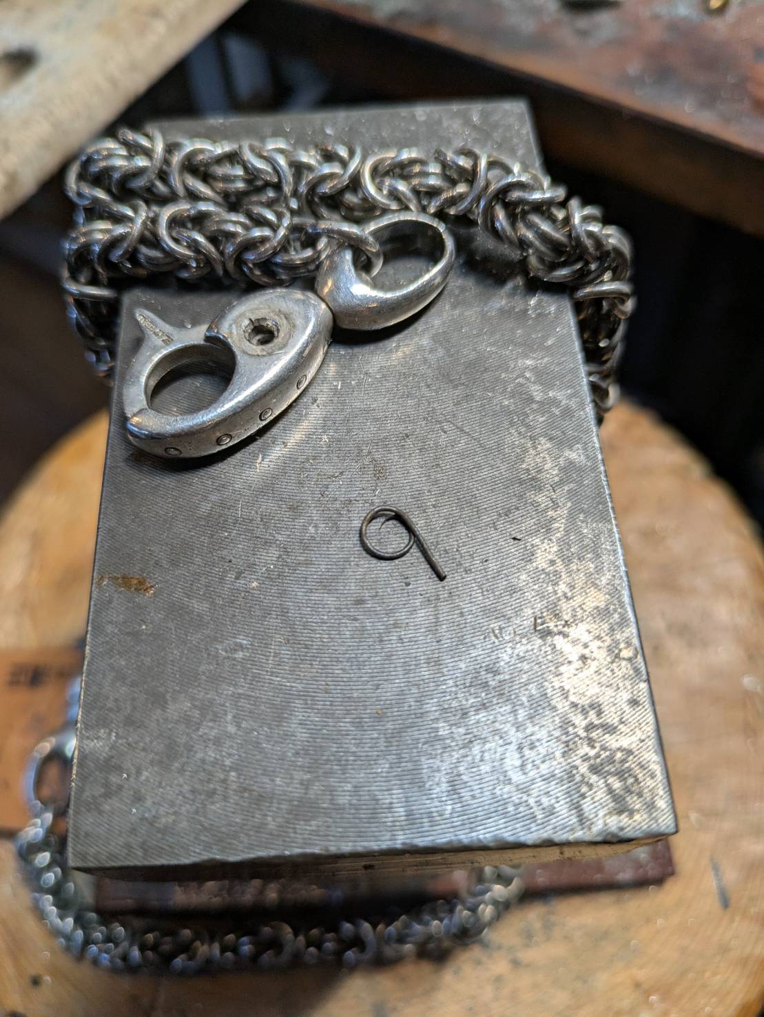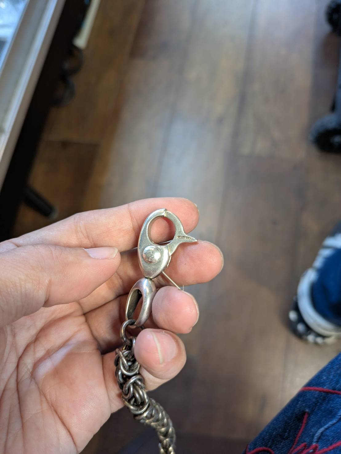 元々問い合わせがあって「現物見せていただける機会があると助かります」とお伝えしたらこのSVチェーンをお持ちになられました。SVウォレットチェーンなので二個ナスカンが付いているのですが二個共壊れてるww