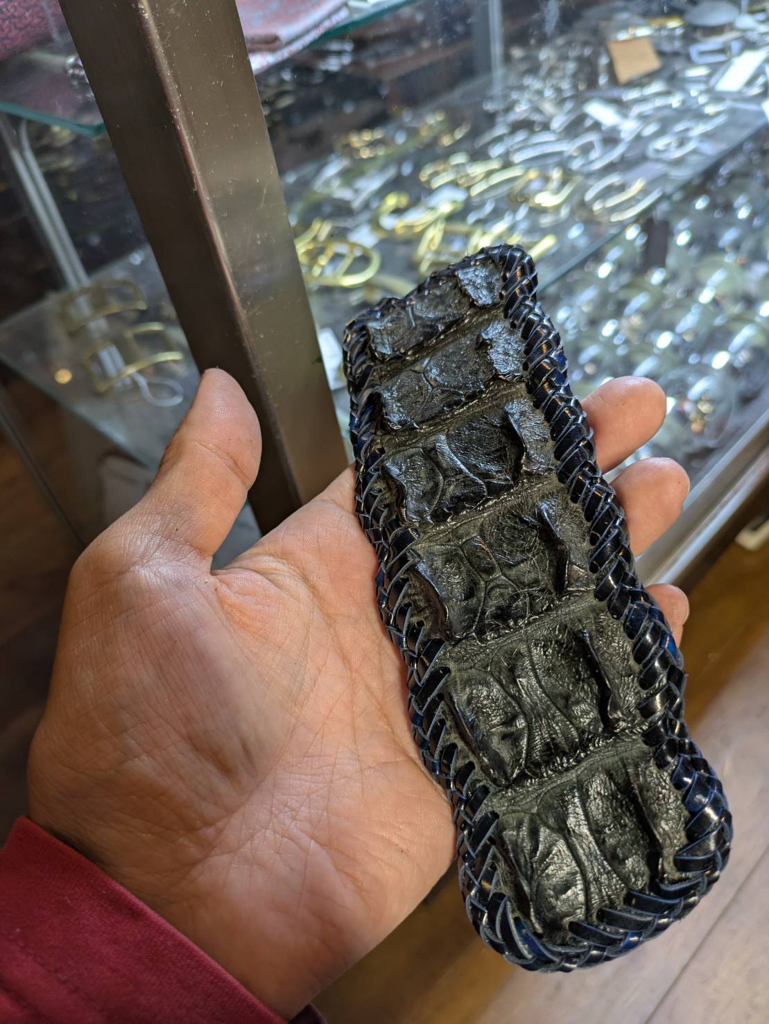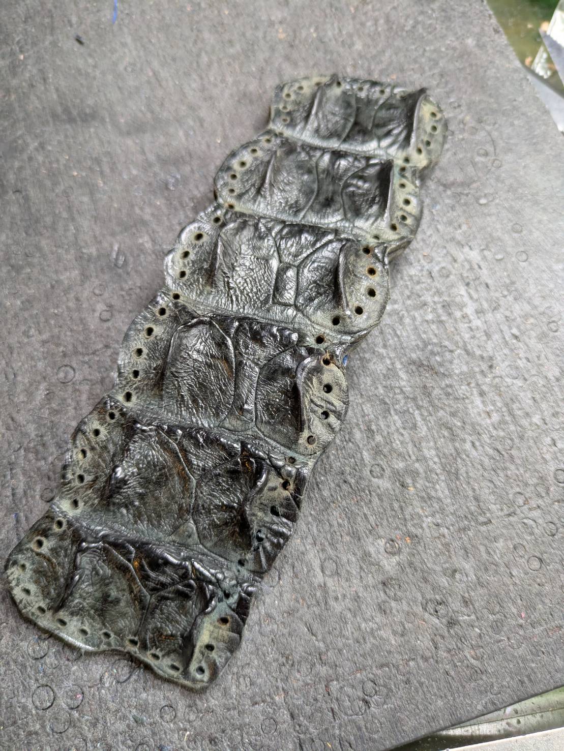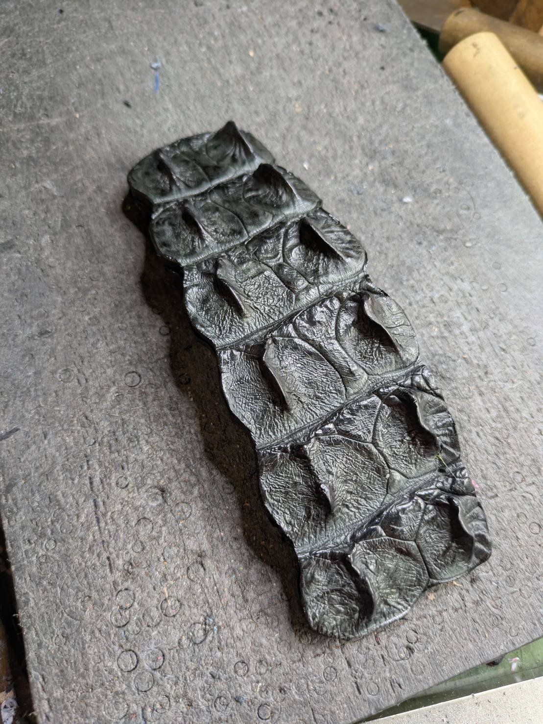 原皮を3mm間隔で裁断してレース紐を製作しかがるとそこには超カッコイイクロコダイルベロが出来上がりました。