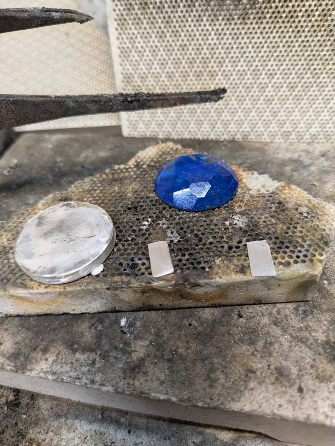 Adoの「O」の部分のセンターにこのラピスラズリを入れたいとのご要望で銀板から印台を製作してコンチョ化はさせずにバー留めにして製作。
