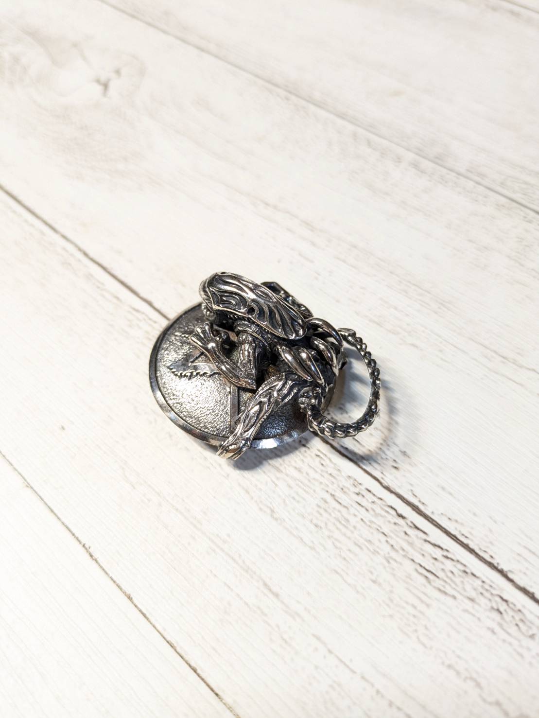 リングの指周りはプレーンに出来ており、指にはめるとまるでエイリアンが巻き付いている感じになるんですけど、その影響で例えばエイリアンの足がなかったり、しっぽが二分化して切れていたりするんですよ。