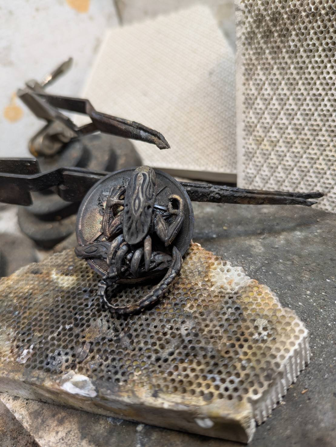 今回はその中でもエイリアンのリングを雷蝶々のコインの上に載せるコンチョです。