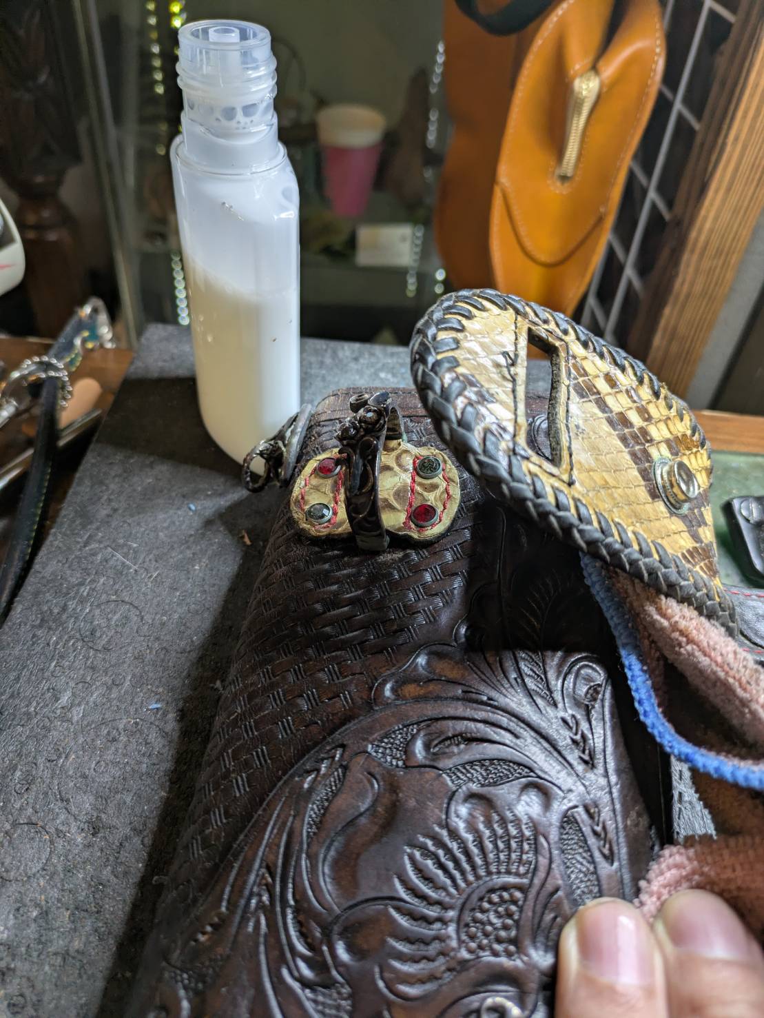 カビ取りも出来るモノと出来ないものがありまして、特にこのカービングが施されたお財布だとカビが段差の根元に入り込んでいたりして非常に困難な作業になるんです。