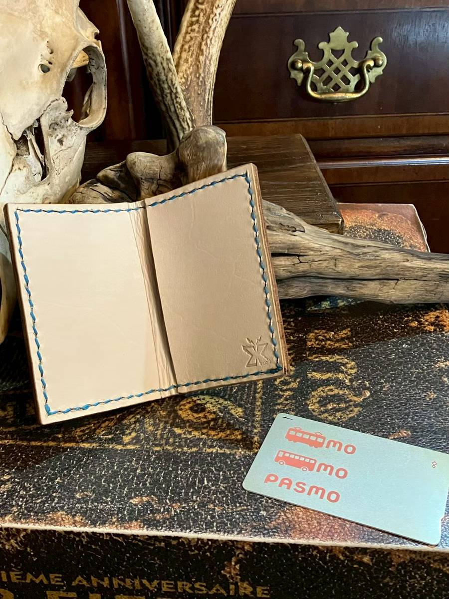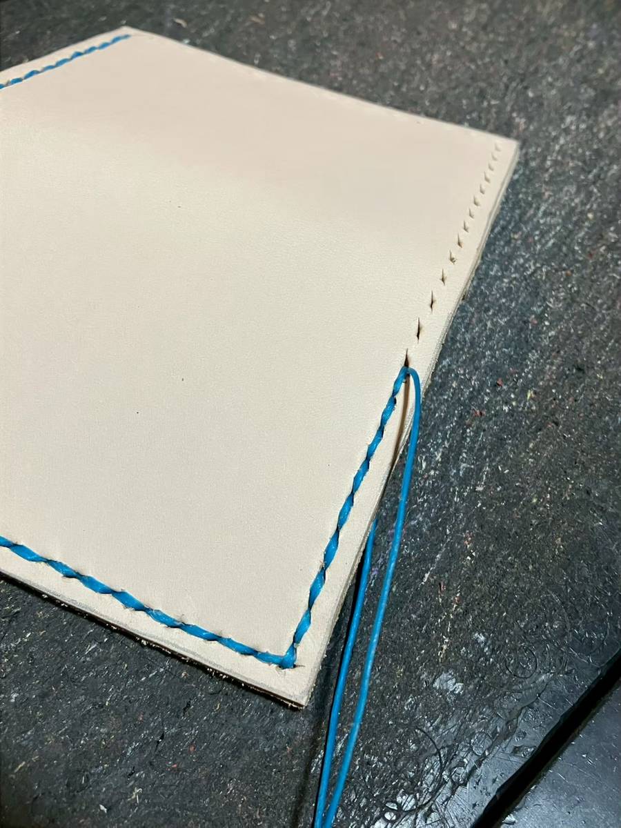ターコイズブルーの蝋引き糸で縫製しまして…からの~