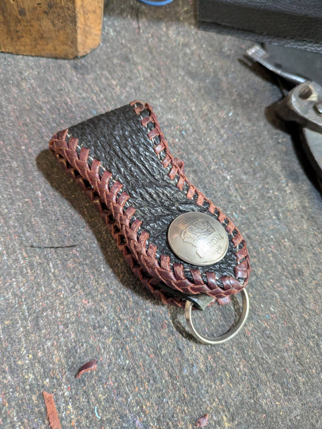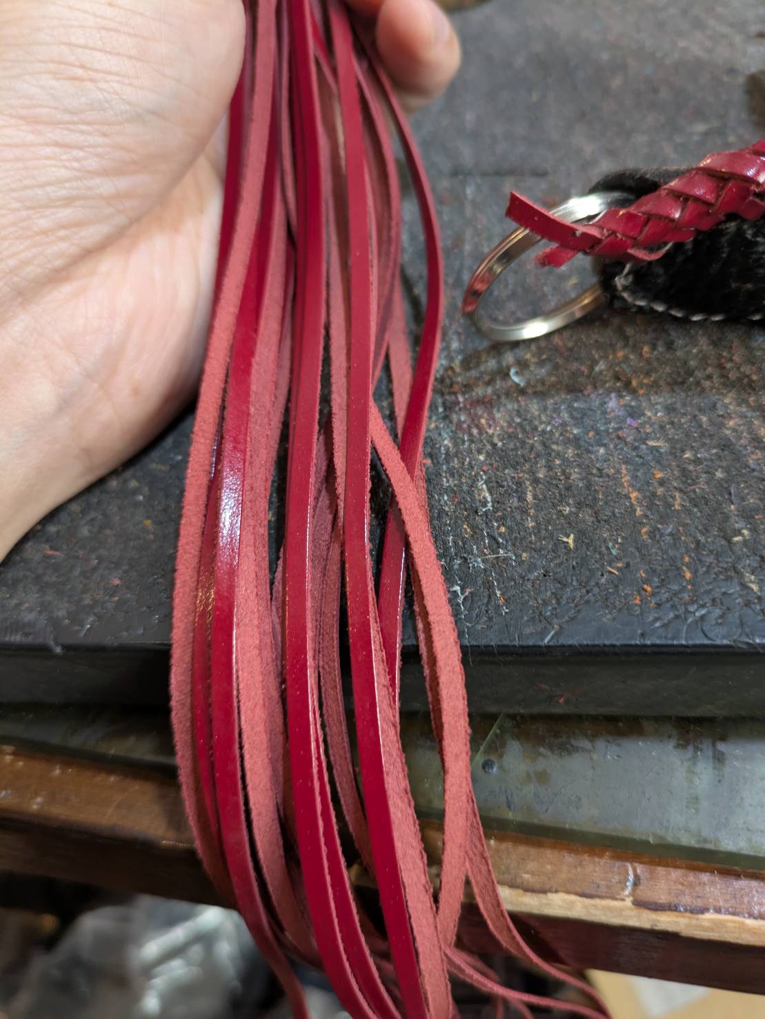 ベルトキーホルダーの外周を測って、7倍の長さのレース紐で編んでいきます!