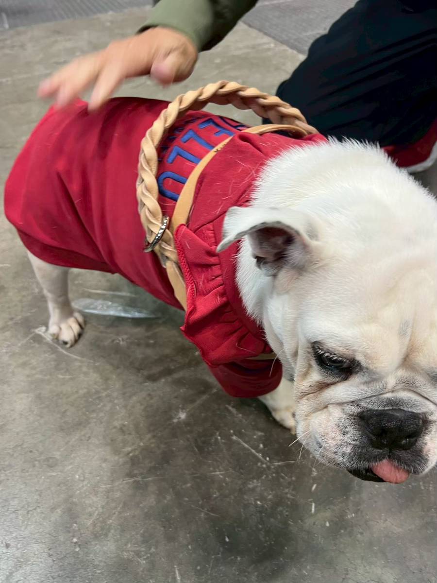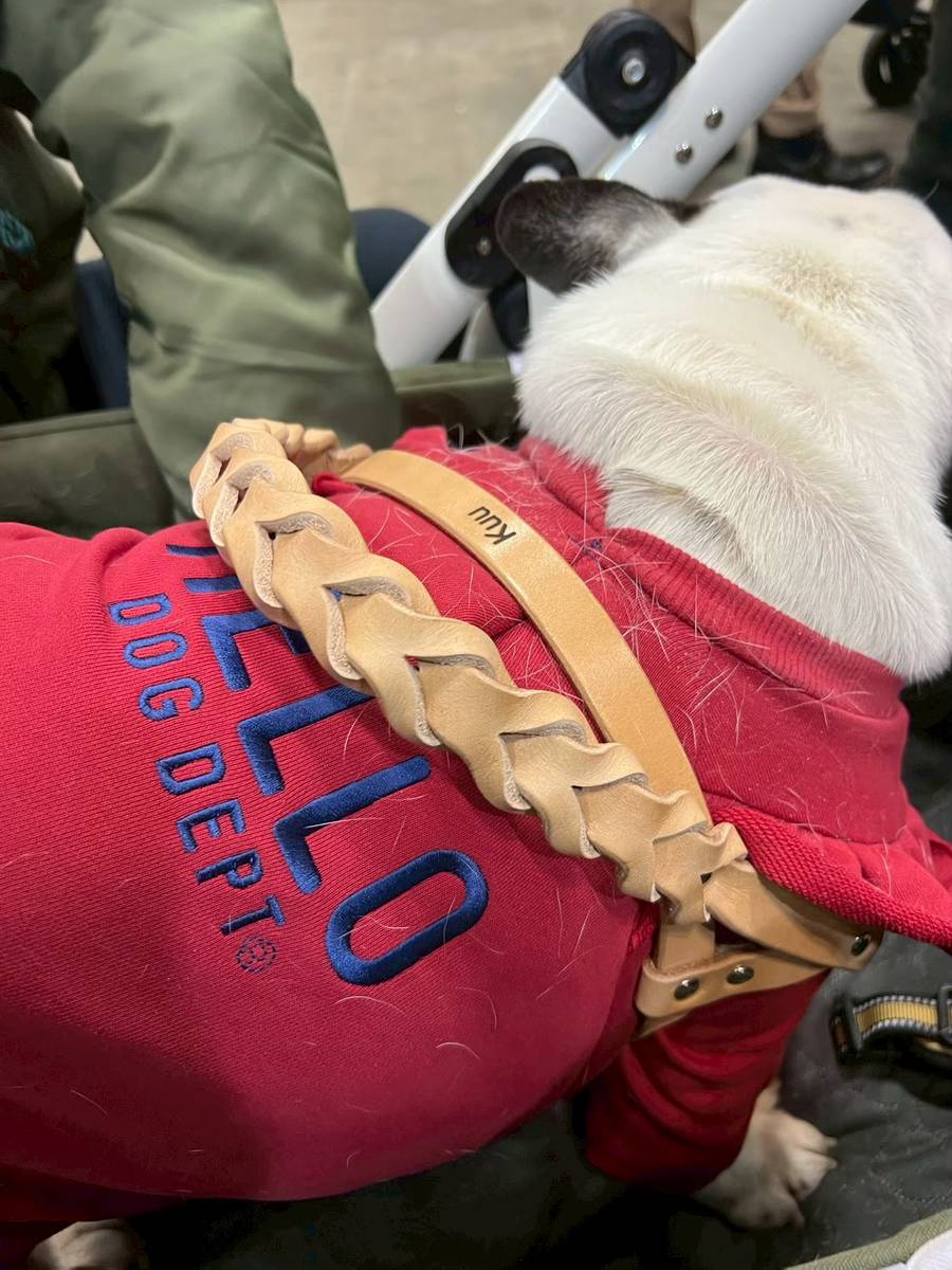 右肩から左肩までを測って、そのワンちゃんの胴回りを測って肩と胴で結ばれるハーネスになります!